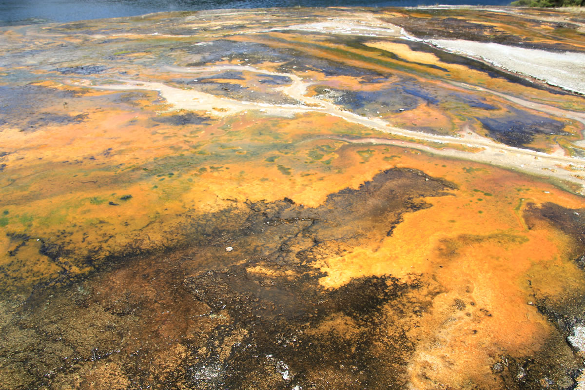 On the northern side of Rainbow Terrace, micro-terracettes have forms. Microscope photos show these micro-terraces are composed of microbes in the brown/black mat. The microbes grow vertically as closely-packed pillar-like filamentous structures. They live where the temperature is less than 35°C and the fluid flow is shallow.